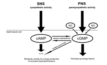 The control of the balance of the autonomic nervous system in cardiac cells, and many other cells, relies on two messenger molecules called cAMP and cGMP. (r) cAMP levels rise in the heart cells when we have a stress response and cGMP levels rise when we are in a relaxation state. The only difference is that when it comes to cGMP, the relax molecule, something else is also needed to increase its levels. That something else is nitric oxide, NO, (r) which is produced in the walls of arteries. These two molecules—cAMP and cGMP—keep each other in check within heart cells, they should always balance each other out. When we experience a stressful response and the nervous system causes spikes in cAMP within the heart then cGMP, provided there is enough NO, also has an increase just to keep the system more in balance. (r) This is depicted in the image below.