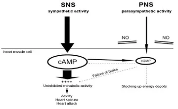 When humans experience decreased vagal tone for long periods of time while also experiencing decreases in NO levels, then during a stress response this can result in a surge in the stress response and subsequent elevation in cAMP in our heart cells without the balanced rise in cGMP. This is shown in the image below.