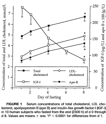 Another study found some very interesting changes in physiology when people fasted. When researchers had a group of people fast for 1-week they saw that their total cholesterol, LDL, and Apo-B levels all go up substantially. LDL went from an average of 114 to 190 (see graph below), that’s a 40% increase. (9) This is likely because the process of making ketones (which the body has to make for a fuel source during fasting) is the same pathway for making cholesterol. So, cholesterol goes up by default.