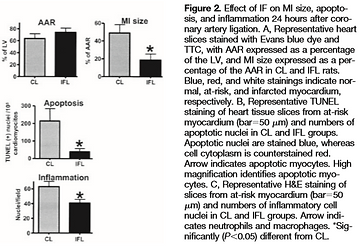 If you follow my blog, you know that I have discussed how cholesterol does not cause heart disease. But this phenomenon of cholesterol and LDL going up shows why those molecules don’t cause heart disease from yet another angle because fasting also has major benefits to the heart. In one study, researchers fed one group of rats on an intermittent fasting schedule and another group more frequently. They then induced heart attacks in all the rats. The group who had been fed on an intermittent fasting schedule had much smaller heart attacks, much lower amounts of apoptosis (programmed cell death of heart tissue), and much lower inflammation overall. (10) You can see this in the graphs below.