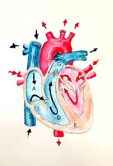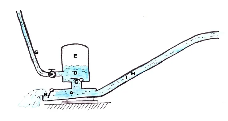 Water is flowing into the ram under the force of gravity through the pipe (I,H). The first chamber (A) catches the water and at first some of the water spills out of the spill valve (B). Once enough water fills the chamber the spill valve closes because of built up pressure and then water pushes up through the one-way valve (C) at the top. Water flowing through here ends up in a second chamber (D). Prior to the water being in here, there would be air, so as the water flows into this chamber it compresses the air building up pressure. Once the pressure builds up enough it pushes the water back down closing the one-way valve (C). Since the water can’t go back the way it came, it goes out through the pipe (G). Once it flows out, pressure drops through the whole system and new water flows into the first chamber (A) starting the whole process again. Now let’s look compare that to the heart.