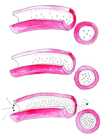 If you need a refresher on the EZ water formation in arteries and how it happens, go back to that other post before continuing. As I mentioned in that post, when EZ water forms in a tube the area that is the EZ water has a net negative charge because of how the water splits. Because EZ water excludes everything that isn’t itself, all the leftover hydrogen ions, along with the other contents of the blood, are pushed into the center of the tube. This creates a situation where we have a highly negative area right next to a very positive area.